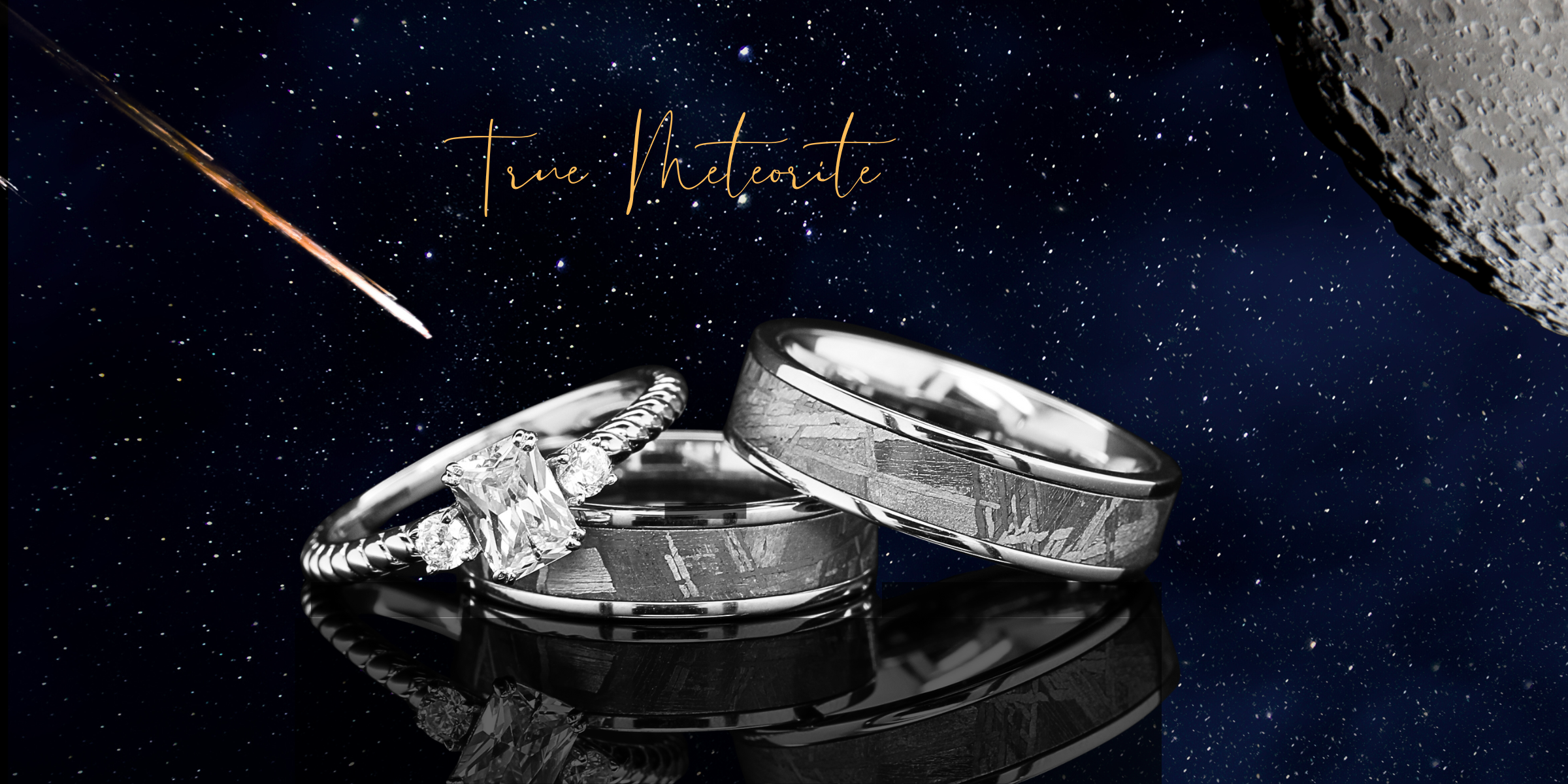 DarkStar - Meteorite Engagement Wedding Rings 3pc | Tungsten & Meteorite His and Hers Wedding Rings Sets