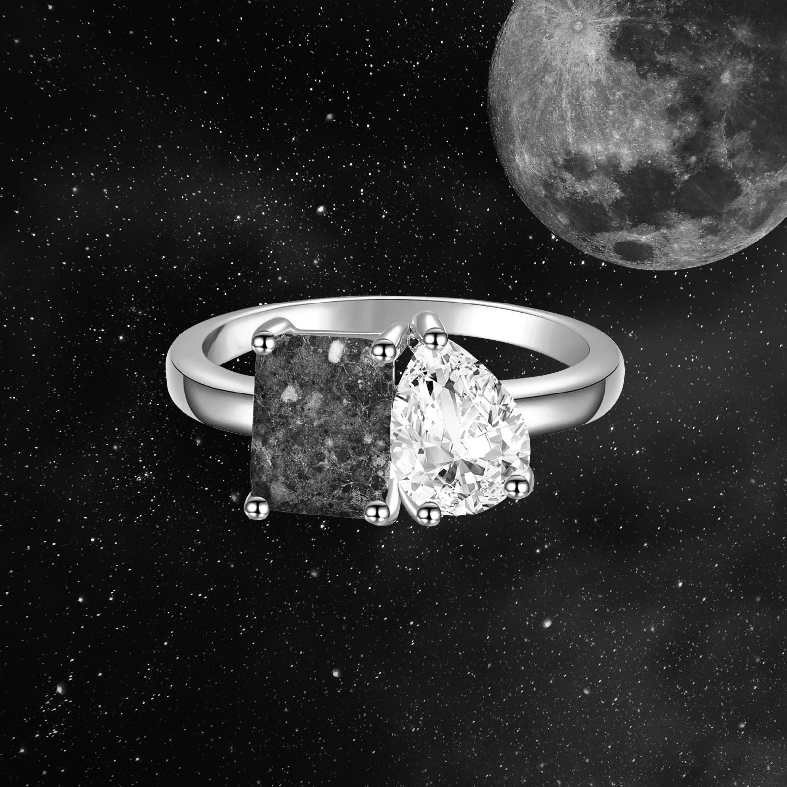 Celestial Duality – 10K Gold or Sterling Silver Engagement Ring for Her | Triangle Moissanite & Lunar Meteorite | D-Color VVS1 Engagement Ring