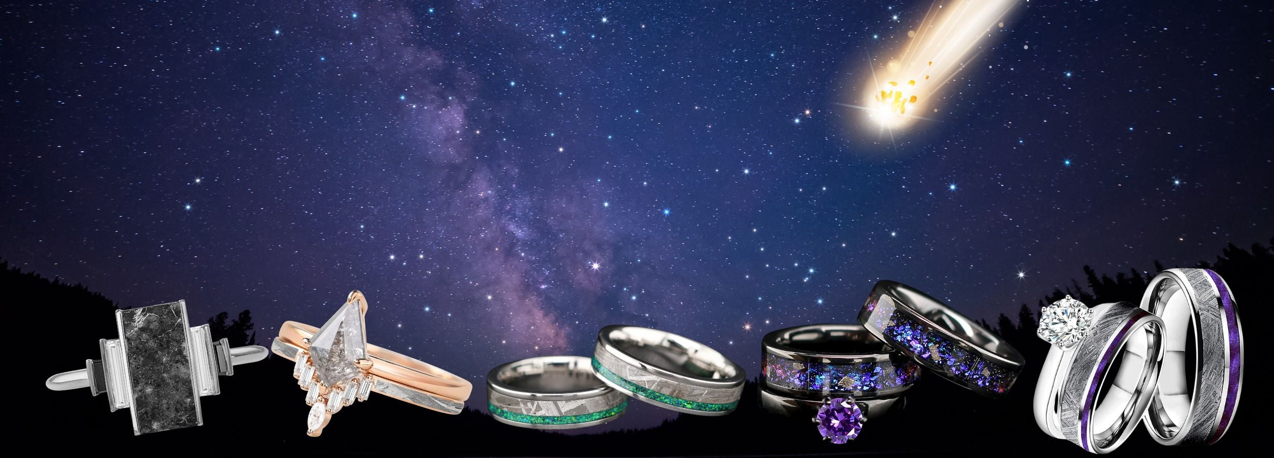 GalacticOpal - Meteorite & Green Opal Rings Set | Engagement Ring & Wedding Bands for Him & Her