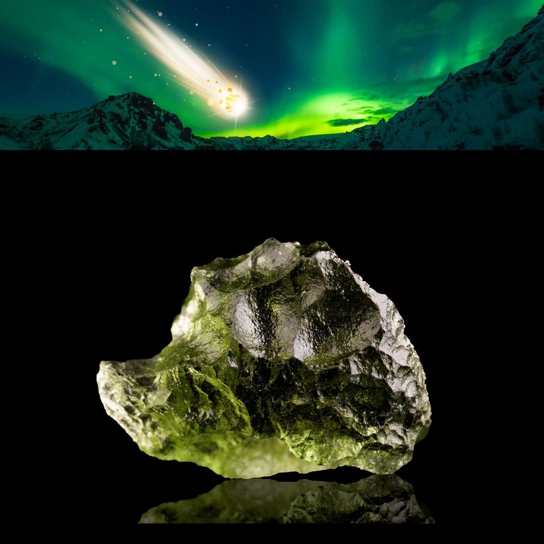 Moldavite is a rare and unique type of tektite, formed from a meteorite impact that occurred around 15 million years ago in the present-day region of southern Germany, known as the Ries Crater. The intense heat and pressure from the impact caused terrestrial silica-rich material to melt and be ejected into the atmosphere. As it cooled, it formed glassy green fragments, which eventually fell to Earth, primarily in areas of the Czech Republic, particularly around the Moldau River, from which the name Moldavite is derived.