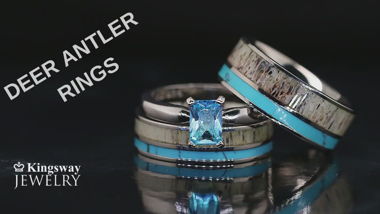 This 4-piece wedding ring set seamlessly combines the beauty of sterling silver, sapphire-colored accents, and the raw allure of turquoise and deer antler inlays. Please note that due to the natural variations of deer antler, the design may differ slightly, adding to the uniqueness of each ring.