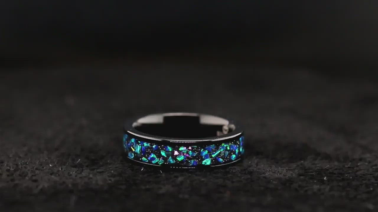 Step into a world of cosmic romance with our opal-inlay wedding bands, designed to capture the magic of the night sky. This band is crafted with care to reflect the beauty of the universe.