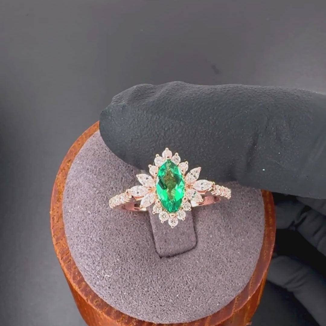 Crafted from solid 14K gold, this luxurious ring features a striking 8x4mm Marquise-Cut Lab-created Emerald, radiating deep green hues reminiscent of a lush forest. Surrounding the centerpiece is a dazzling halo of Natural Diamonds arranged in a floral-inspired design, adding a touch of vintage charm and brilliance.