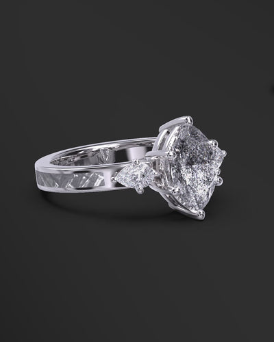 At the center is an 8 x 4mm marquise-cut Galaxy Diamond (approximately 0.42 ct), admired for its unique, galaxy-like inclusions that make every stone truly one of a kind. The elongated marquise shape creates a graceful silhouette and adds a modern edge to the design. Flanking the center stone are pear-cut Diamond side stones (approximately 0.30 ct total weight), which form a subtle halo effect and add balanced sparkle and depth.