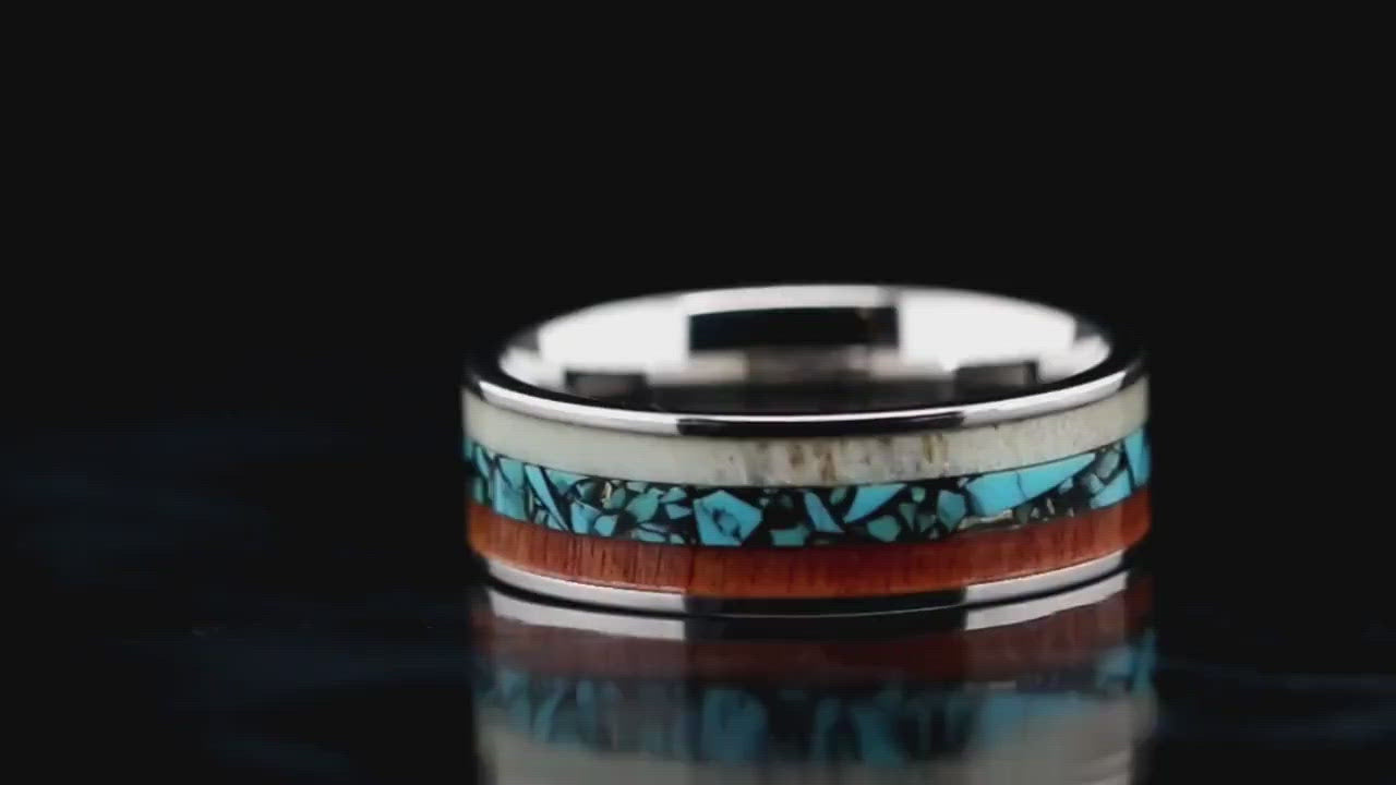 Stainless Steel Deer Antler Band Turquoise and Koa Wood Ring