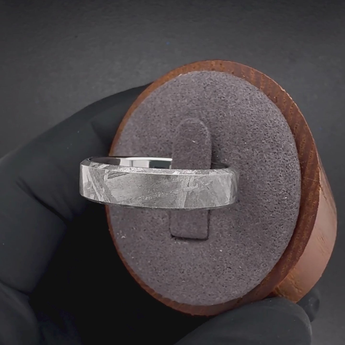 This men's wedding band, crafted from durable tungsten and features a unique meteorite inlay. The combination of tungsten’s sleek strength and the cosmic elegance of a meteorite creates a bold, modern symbol of enduring love.